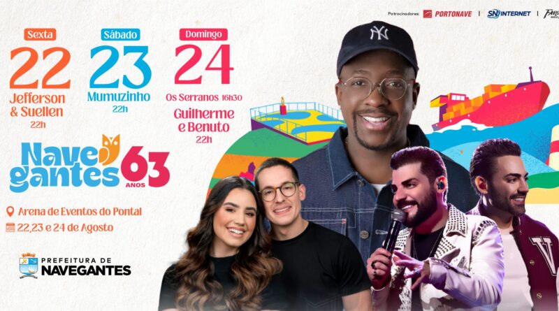 A cidade de Navegantes vai comemorar seus 63 anos em grande estilo com uma série de atrações musicais gratuitas na Arena de Eventos do Pontal, entre os dias 22 e 24 de agosto. Entre os destaques da festa estão os shows nacionais de Mumuzinho, Guilherme & Benuto, Jefferson & Suellen e Os Serranos, prometendo agradar públicos de todas as idades.