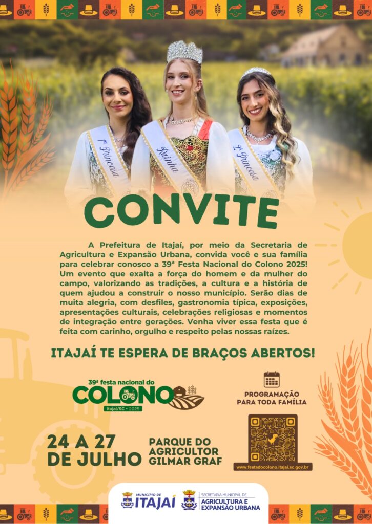 “A Prefeitura de Itajaí, por meio da Secretaria de Agricultura e Expansão Urbana, tem a honra de convidar a imprensa de Itajaí e região para participar da cerimônia de abertura oficial da 39ª Festa Nacional do Colono, a realizar-se no dia 24 de julho de 2024 (quarta-feira), às 19h, no Parque do Agricultor Gilmar Graf, localizado na rua Mansueto Felizardo Vieira, 557, no bairro Baía, em Itajaí.