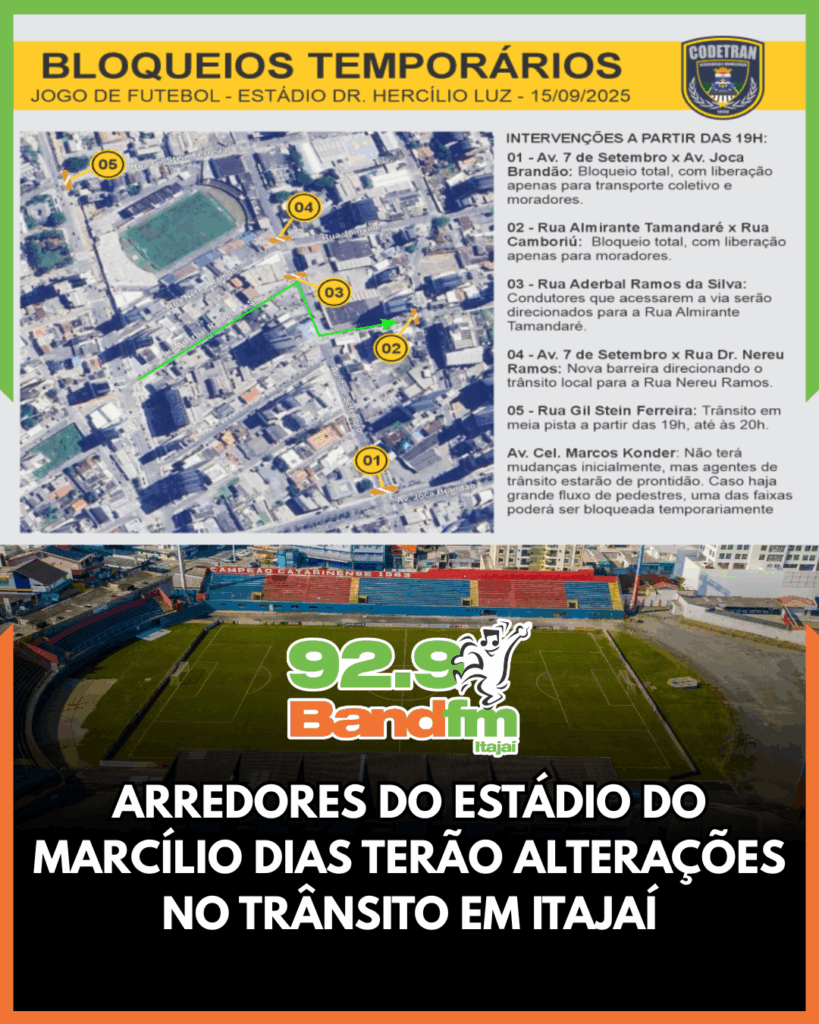 Av. Cel. Marcos Konder: Não terá mudanças inicialmente, mas agentes de trânsito estarão de prontidão. Caso haja grande fluxo de pedestres, uma das faixas poderá ser bloqueada temporariamente.