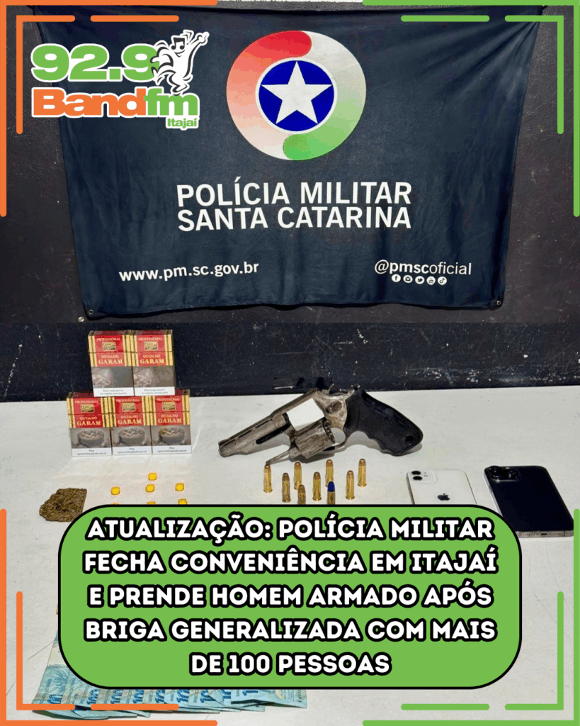 Na madrugada de domingo (10), a Polícia Militar voltou a ser acionada para um bar/conveniência na Rua Blumenau, em Itajaí, local que já havia sido destaque em reportagens anteriores da Band FM. A guarnição foi informada de que um homem armado participava de um tumulto e, ao chegar, encontrou mais de 100 pessoas aglomeradas. O suspeito tentou fugir a pé, sacou um revólver calibre .38 com numeração suprimida e munições, e foi detido após disparos de contenção que não o atingiram.