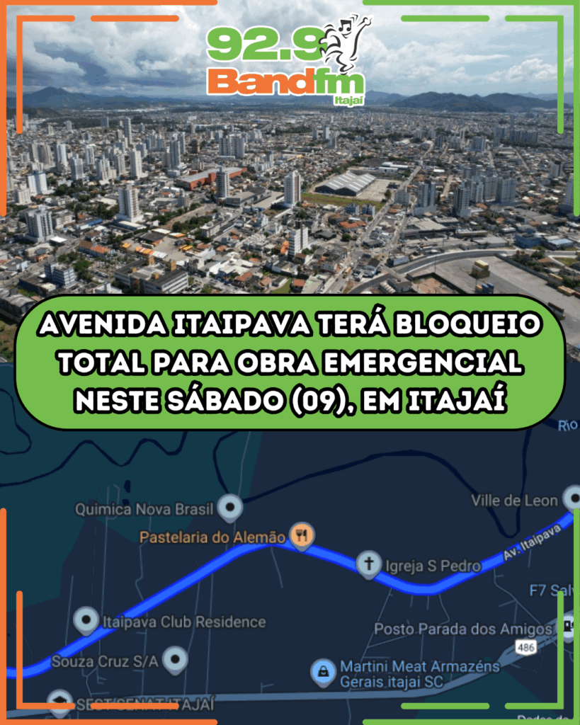 O Município de Itajaí informa que neste sábado (09), a partir das 8h, ocorrerá intervenção emergencial na tubulação do sistema de coleta de águas pluviais e água servida na avenida Itaipava, na altura do número 175. A via será bloqueada.