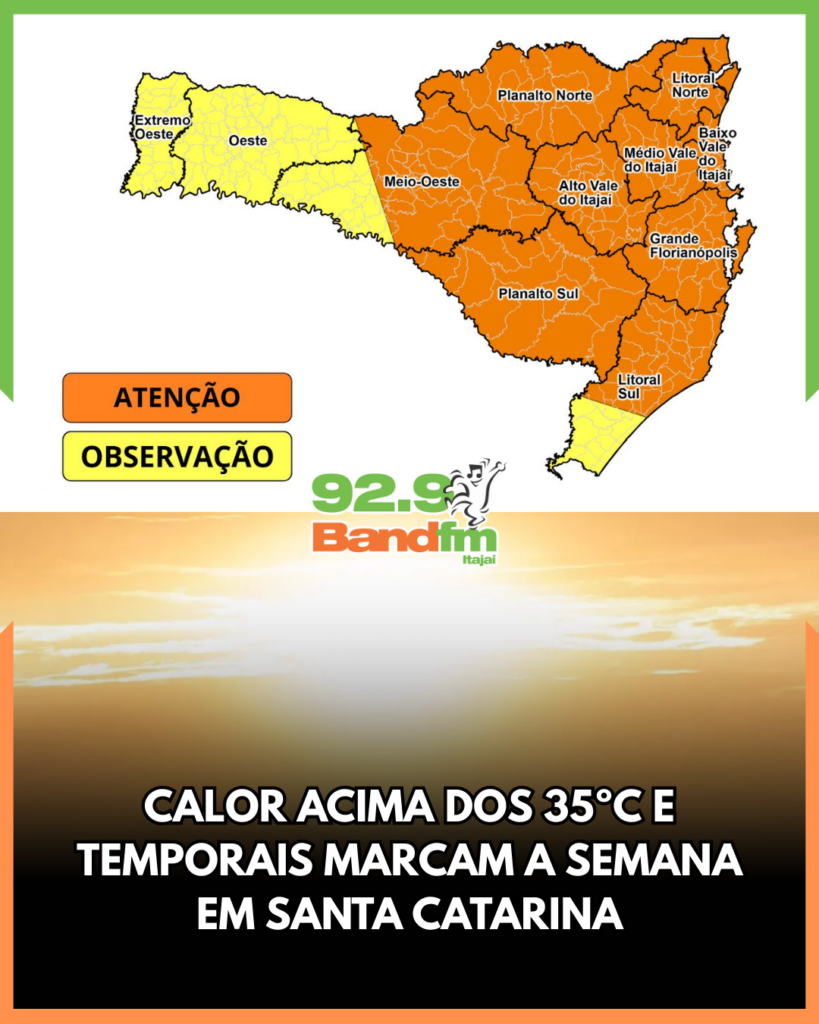 Santa Catarina terá uma semana de calor intenso e temporais típicos de verão. As temperaturas superam os 30°C em todas as regiões e passam dos 35°C no Extremo Oeste e em áreas do Vale do Itajaí. Apesar do predomínio de sol pela manhã, o calor e a umidade favorecem pancadas de chuva entre a tarde e a noite, que podem ser fortes e acompanhadas de raios e rajadas de vento.