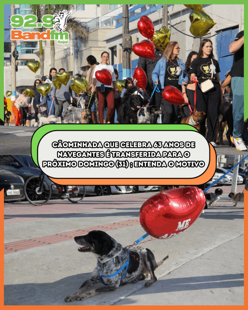 Devido à previsão de chuva, a tradicional Cãominhada de Navegantes, que inicialmente aconteceria em 26 de agosto, foi transferida para o próximo domingo, dia 31 de agosto, no mesmo local e horário. O ponto de encontro será na Praça Marília Soares, no bairro Gravatá, com concentração a partir das 9h da manhã.