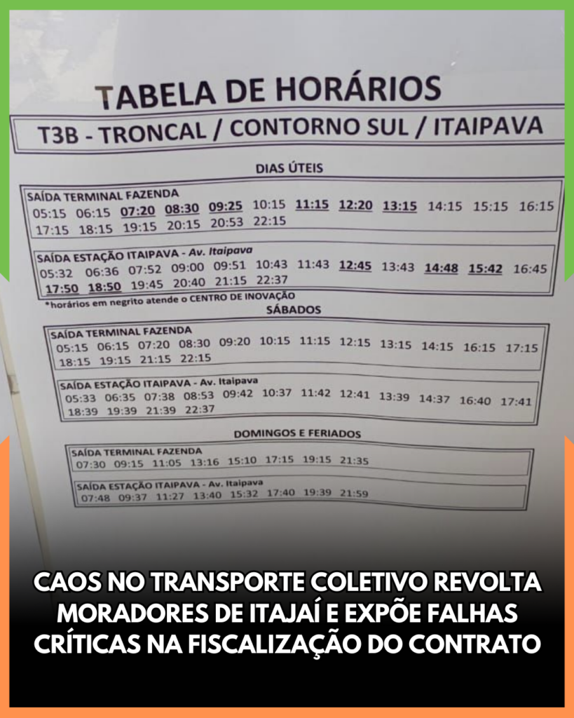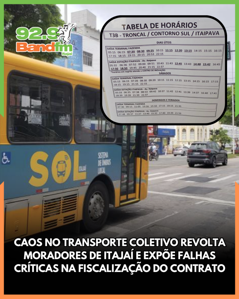 Usuários do transporte coletivo de Itajaí voltam a denunciar atrasos, superlotação e descumprimento de horários por parte da empresa Atalaia/Sistema de Ônibus Local (SOL). Moradores de bairros como Itaipava, Cordeiros e Ressacada relatam que os ônibus não passam nos horários previstos na tabela e que sequer há informações claras sobre as linhas. Segundo ouvintes da Band FM, dezenas de reclamações foram registradas apenas na manhã desta quarta-feira (04), apontando veículos lotados e longas esperas nos pontos.