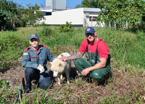 A guarnição do ABTR-209 se deslocou até o local indicado e encontrou o cão preso pela guia em uma área de mata. Com cuidado e técnica, os bombeiros conseguiram retirar o animal com segurança e, felizmente, ele não apresentava ferimentos.