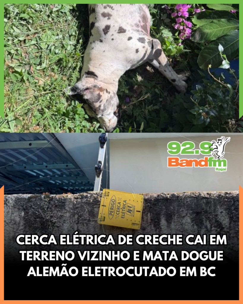 Um dogue alemão morreu eletrocutado após a cerca elétrica de uma creche cair dentro do terreno vizinho, na manhã desta segunda-feira (5), no bairro Vila Real, em Balneário Camboriú. A tutora, a médica Raquel Lopes, registrou boletim de ocorrência e relatou que o animal, chamado Lorenzo, encostou nos fios energizados e não resistiu, apesar das tentativas de socorro feitas pela família.