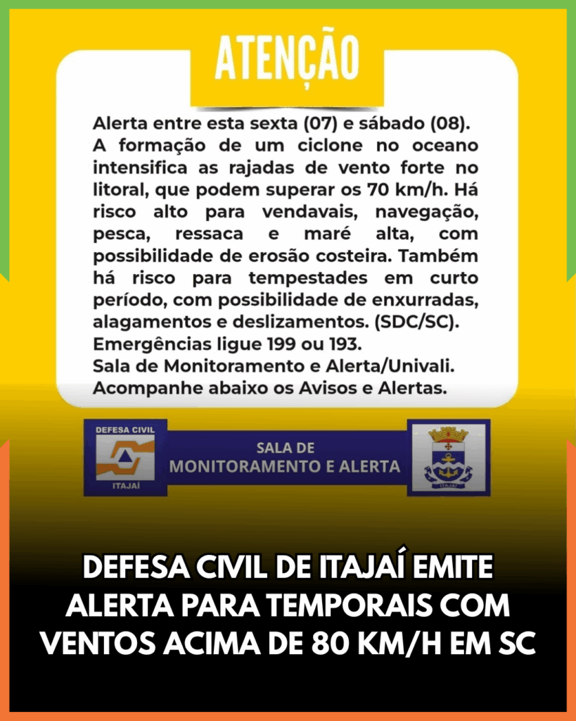 A Defesa Civil de Itajaí emitiu um alerta meteorológico para a ocorrência de temporais com vendaval, chuva intensa, raios e queda de granizo entre a tarde desta sexta-feira (7) e a madrugada de sábado (8). O fenômeno está associado à formação de um ciclone extratropical em alto-mar, entre as costas do Sul e Sudeste do Brasil, o que deve intensificar as instabilidades em todas as regiões catarinenses.