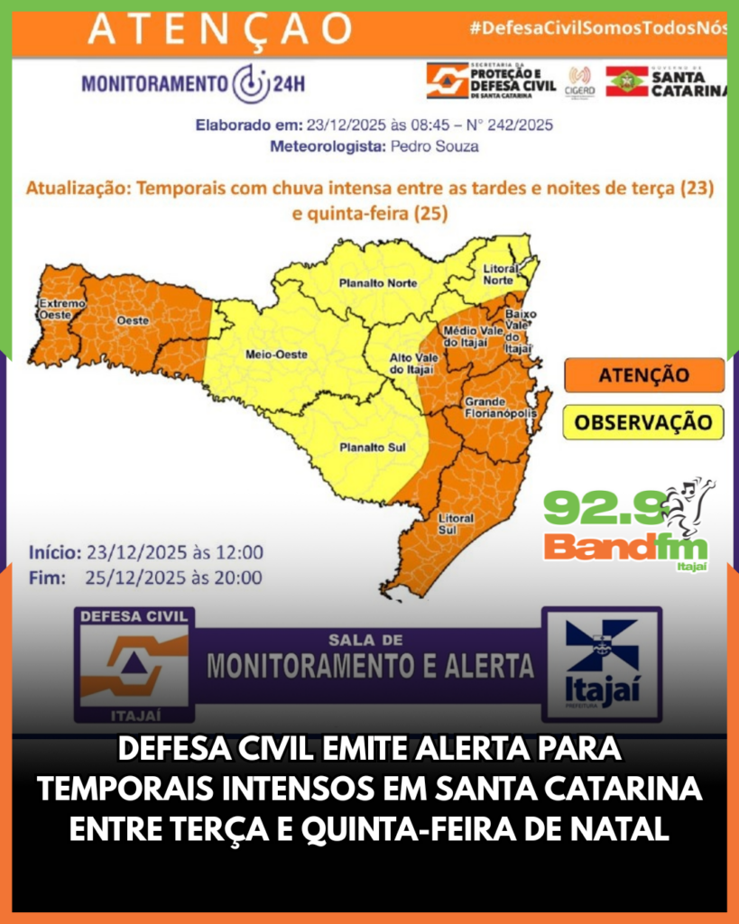 A Defesa Civil de Santa Catarina emitiu aviso meteorológico alertando para o aumento das condições de temporais com chuva intensa entre as tardes e noites de terça-feira (23) e quinta-feira (25). O risco é considerado alto nas áreas classificadas em laranja, especialmente para alagamentos e enxurradas pontuais, enquanto nas regiões em amarelo o risco é moderado. Em todo o estado, há possibilidade de destelhamentos, danos na rede elétrica e queda de galhos e árvores.