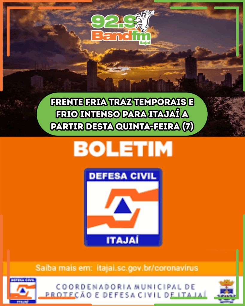 A Defesa Civil de Itajaí emitiu um novo alerta para a população sobre a chegada de uma frente fria que deve provocar instabilidade no tempo a partir da noite desta quinta-feira (07). O avanço de um sistema de baixa pressão pode causar pancadas de chuva, trovoadas e fortes rajadas de vento na região do Litoral Norte e Vale do Itajaí.