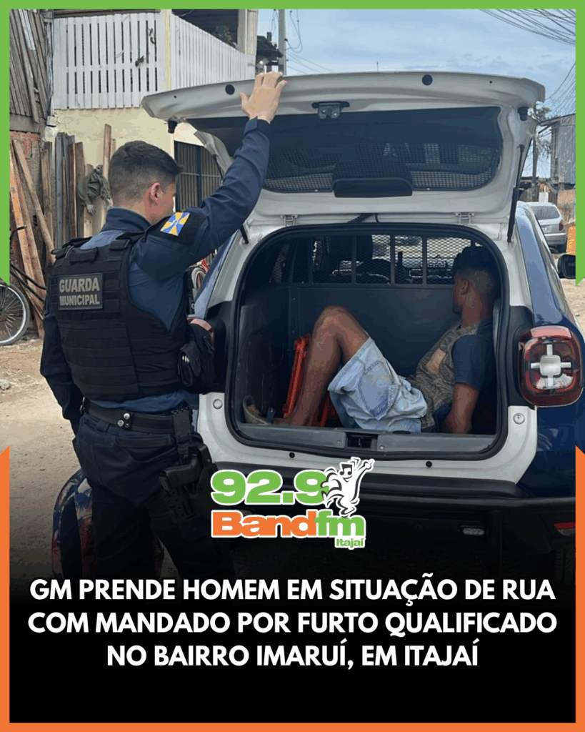A Guarda Municipal de Itajaí cumpriu um mandado de prisão na tarde desta quarta-feira (12) contra um homem de 25 anos, natural de São Paulo e em situação de rua, durante patrulhamento de rotina no bairro Imaruí. A ordem judicial, expedida pela Justiça de Itajaí, estava relacionada a um crime de furto qualificado, previsto no artigo 155 do Código Penal.