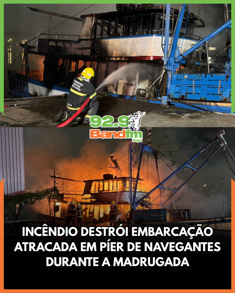 Um incêndio em uma embarcação atracada mobilizou o Corpo de Bombeiros Militar na madrugada deste sábado (20), em Navegantes. A ocorrência foi registrada por volta das 23h55, na Avenida Orlando Ferreira, e envolveu um barco de aproximadamente 24,7 metros de comprimento, que já estava com a parte superior do convés tomada pelas chamas quando as equipes chegaram ao local.