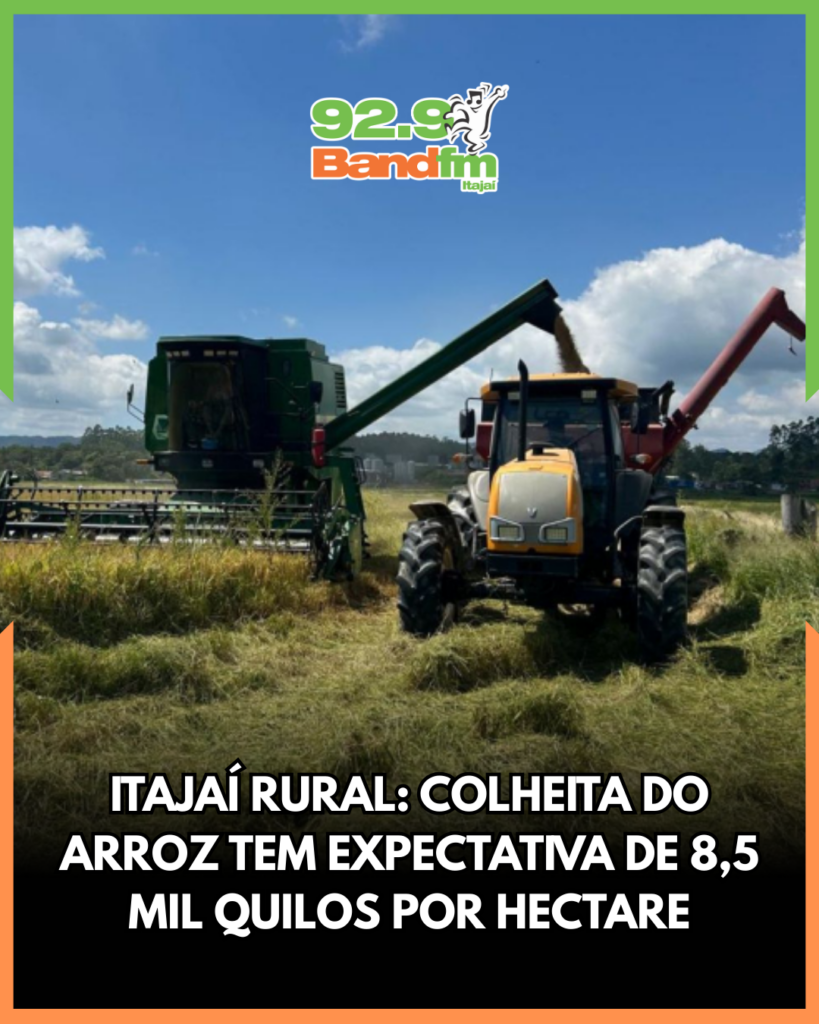 A colheita do arroz já começou na zona rural de Itajaí e deve se estender até maio, mobilizando produtores em cerca de 1.700 hectares cultivados. A expectativa para a safra é positiva, com projeção média de 8,5 mil quilos por hectare, o que representa aproximadamente 289 mil sacas de 50 quilos. Considerado o principal cultivo agrícola do município, o arroz irrigado mantém papel estratégico na economia local e na geração de renda no campo.