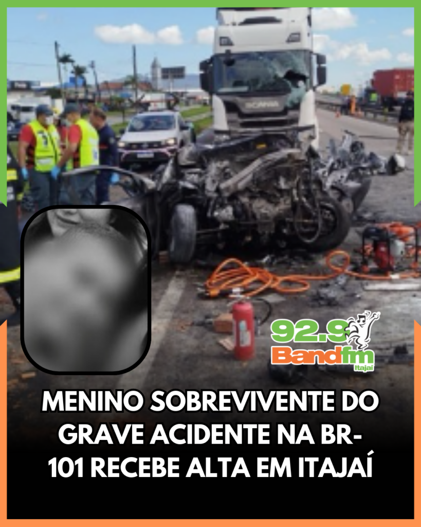 A Secretaria Municipal de Saúde de Itajaí informou que o menino de 10 anos, único sobrevivente do grave acidente registrado na BR-101, receberá alta hospitalar na tarde desta quinta-feira (19). A criança estava internada na UTI do Hospital Pequeno Anjo, onde passou por atendimento intensivo após a colisão ocorrida na manhã de quarta-feira (18).