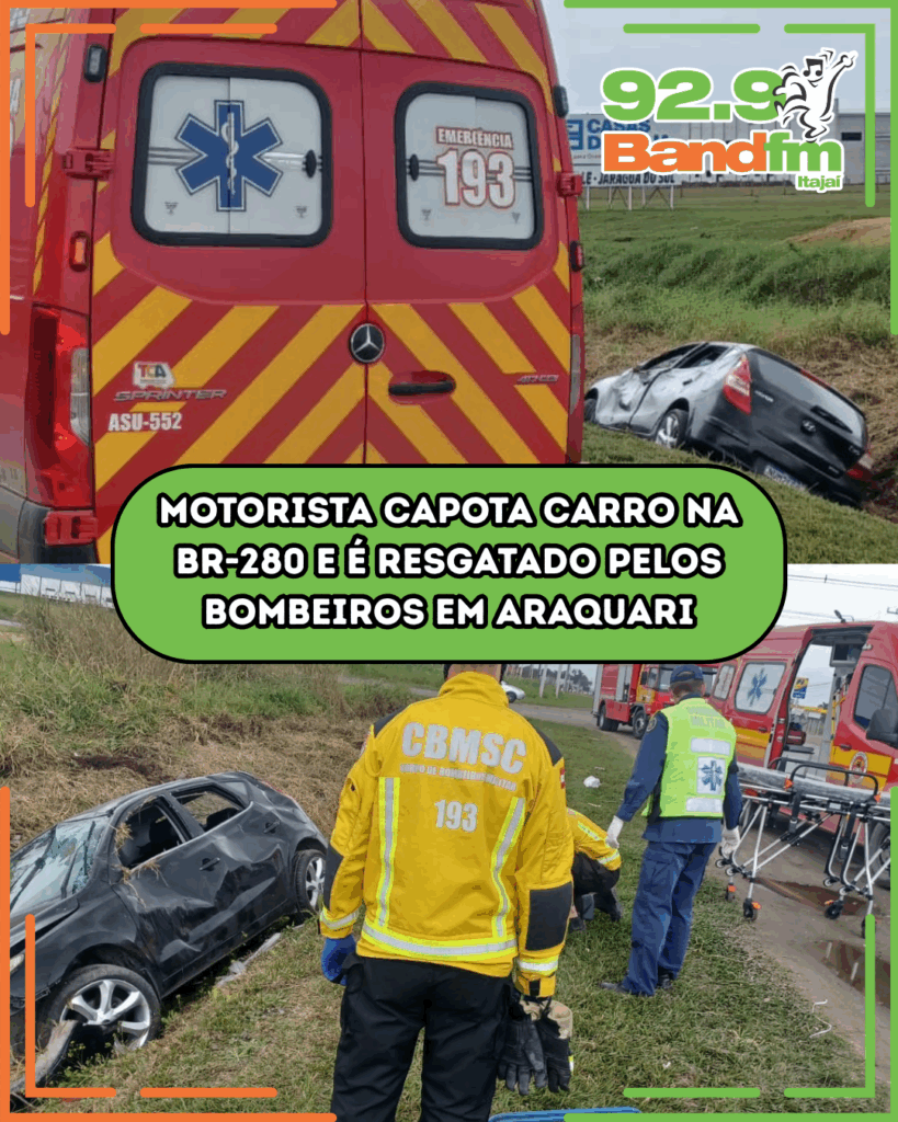 Um homem de 30 anos ficou ferido após perder o controle do veículo e capotar um Hyundai i30 na BR-280, em Araquari (SC), na tarde desta quarta-feira (6). O acidente ocorreu por volta das 13h57, no km 1625 da rodovia. O Corpo de Bombeiros foi acionado e encontrou a vítima já fora do carro, com escoriações e suspeita de luxação no punho.