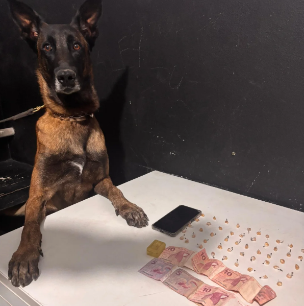 Em uma rua próxima, um homem de 29 anos também foi abordado. Com ele, foram encontrados R$ 30,00 em notas trocadas e um telefone celular. O cão Bruce novamente indicou positivamente a presença de drogas, desta vez em um pote escondido atrás de uma madeira, onde foram encontradas 13 porções de crack. Ambos os suspeitos foram conduzidos à Central de Plantão Policial para os procedimentos legais.