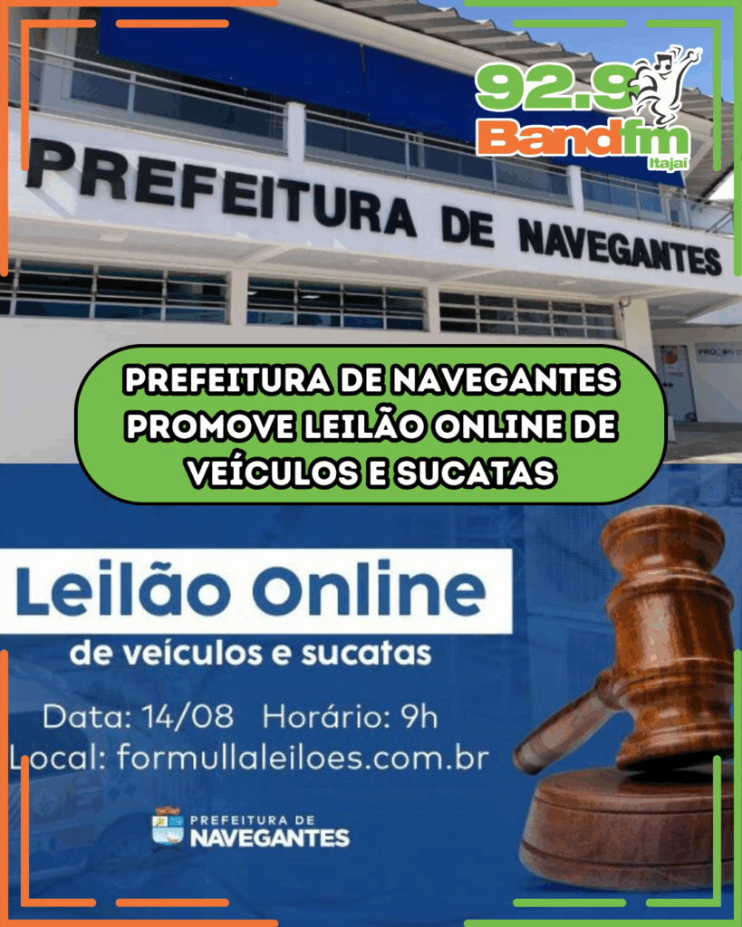 A Prefeitura de Navegantes realizará um leilão público online no dia 14 de agosto, às 9h, para venda de 34 lotes de bens móveis considerados inservíveis, como veículos, sucatas e equipamentos diversos. O certame será feito pela plataforma formullaleiloes.com.br.