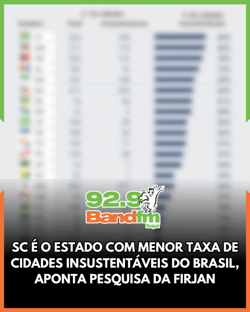 Santa Catarina se destacou em um levantamento da Firjan (Federação das Indústrias do Estado do Rio de Janeiro) como o estado com menor número de municípios insustentáveis no Brasil. Dos 295 existentes, apenas Pescaria Brava foi classificada nessa condição.
