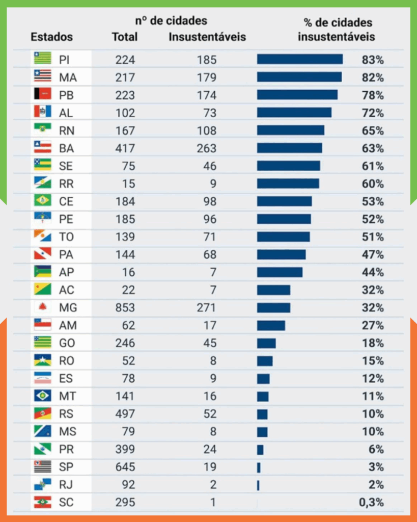 No ranking nacional, o Rio de Janeiro aparece em segundo lugar e São Paulo em terceiro entre os estados com maior número de cidades insustentáveis.