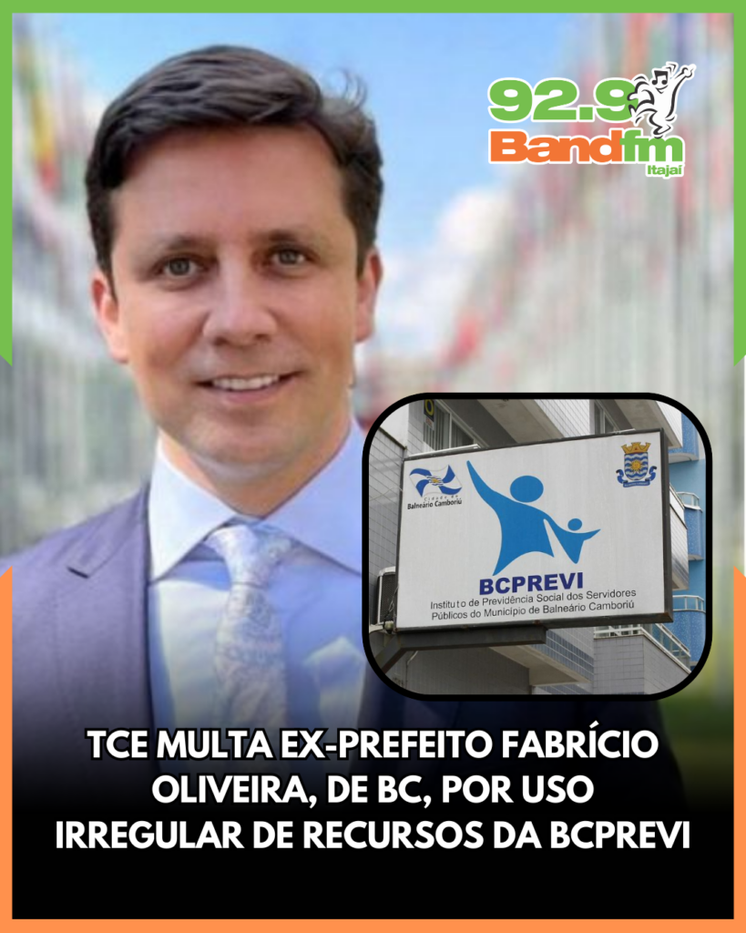 O ex-prefeito de Balneário Camboriú, Fabrício Oliveira, foi multado em R$ 17 mil pelo Tribunal de Contas do Estado de Santa Catarina (TCE/SC) por uso irregular de recursos do BCPrevi, o instituto de previdência dos servidores públicos do município. De acordo com o tribunal, valores do fundo previdenciário foram utilizados para custear a contribuição patronal do plano de saúde de aposentados e pensionistas — despesa que deveria ser paga pela prefeitura. O montante utilizado dessa forma ultrapassa R$ 15 milhões entre 2015 e 2023.