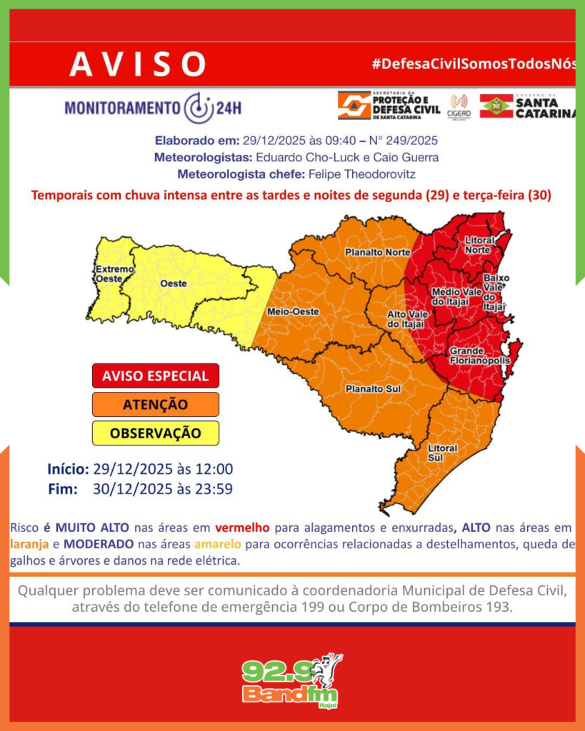 O risco é muito alto nas áreas do Planalto Norte, Litoral Norte, Vale do Itajaí e Grande Florianópolis e parte do Litoral Sul, especialmente entre o meio da tarde e o início da noite.
