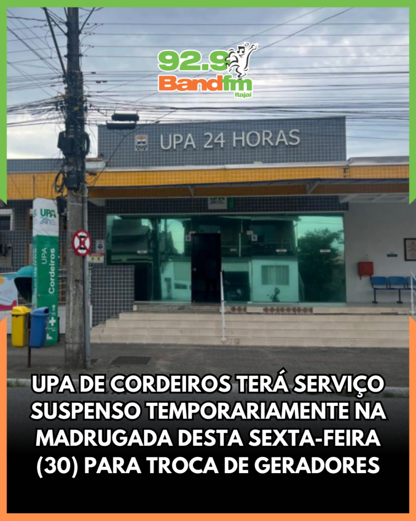 O Município de Itajaí , por meio da Secretaria Municipal de Saúde, comunica que na madrugada desta sexta-feira (30) das 3h às 6h30, a UPA de Cordeiros terá o atendimento temporariamente suspenso para a realização da troca do gerador de energia da unidade.