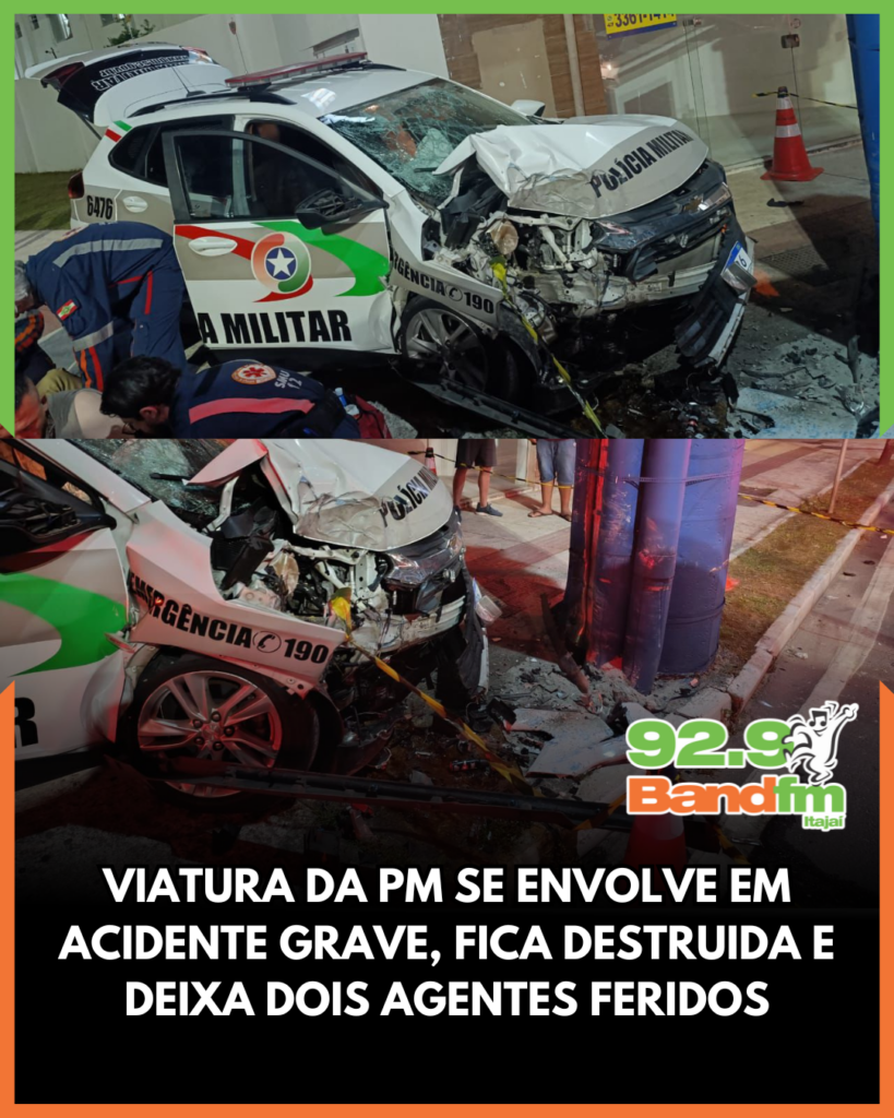 Um grave acidente envolvendo uma viatura da Polícia Militar deixou dois policiais feridos na madrugada desta sexta-feira (12) no Centro de Balneário Camboriú. A colisão ocorreu na Avenida Santa Catarina, nas proximidades da Rua 10, e resultou na destruição completa do veículo oficial. Os agentes foram socorridos por equipes de emergência e encaminhados ao Hospital Regional Ruth Cardoso, apresentando fraturas no braço e no quadril.