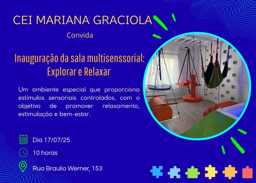 O Centro de Educação Infantil Mariana Graciola realizará a inauguração da “Sala Multisensorial Snoezelen – Explorar e Relaxar” na próxima quinta-feira (16), às 10h. Este espaço faz parte de um dos 28 projetos contemplados pela Central de Penas Pecuniárias da Comarca de Itajaí.