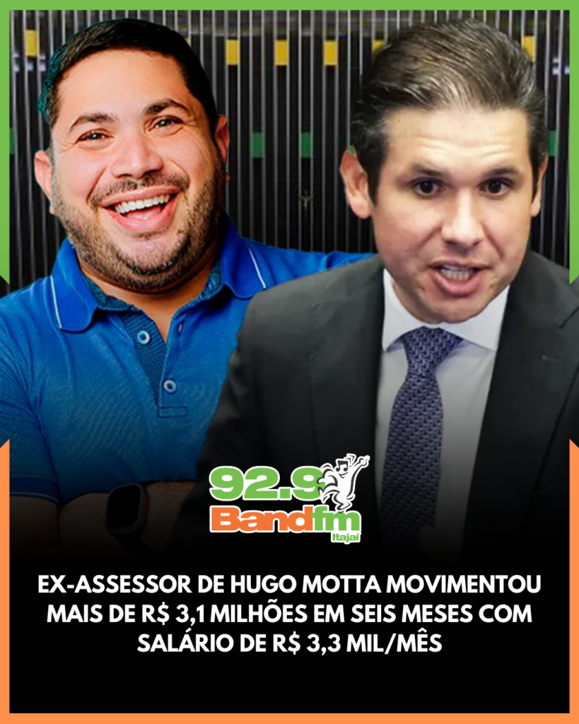 Um ex-assessor do presidente da Câmara, Hugo Motta, movimentou R$ 3,1 milhões em apenas seis meses enquanto ocupava cargo no gabinete do parlamentar. Jerônimo Arlindo da Silva Júnior, conhecido como Júnior do Peixe, recebia salário líquido mensal de R$ 3,3 mil como secretário parlamentar 5 (SP-05), um dos cargos mais baixos da Casa, entre outubro de 2020 e março de 2021.