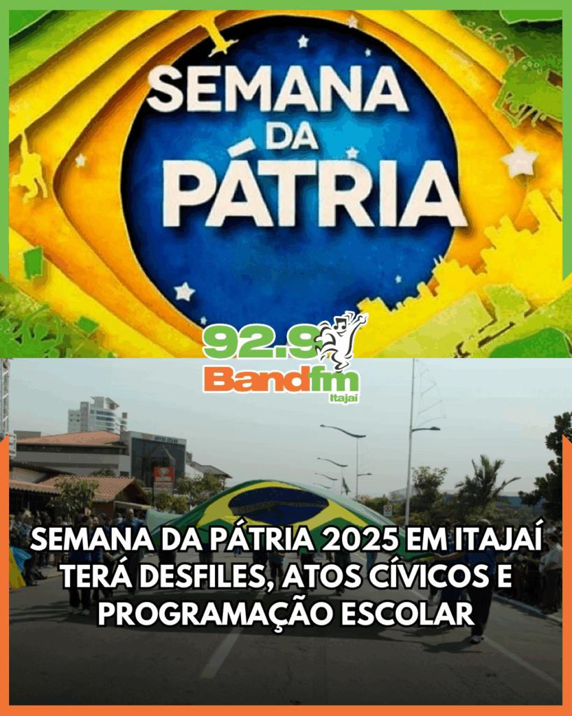 Itajaí inicia nesta segunda-feira (1º) a Semana da Pátria 2025, que segue até o dia 7 de setembro com o tema “Itajaí no caminho, Brasil no coração”. A abertura oficial será às 9h, na Praça Governador Irineu Bornhausen, com presença de autoridades, execução de hinos pela Banda Filarmônica e apresentações de estudantes da rede municipal.